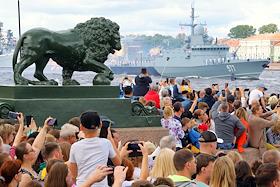 Репетиция парада ко Дню Военно-Морского флота (ВМФ) в акватории Невы. Жанровая фотография. Зрители…
