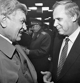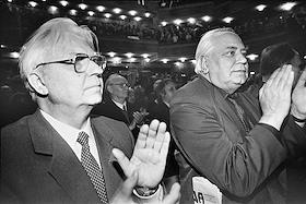 Конгресс народов СССР в здании МХАТ имени Горького. Член ЦК КПРФ Егор Лигачев (справа) во время…