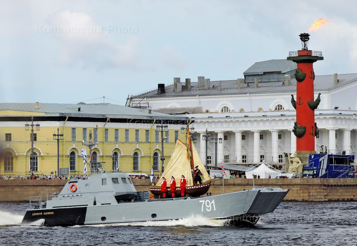 Виды Санкт-Петербурга. Десантный катер "Алексей Баринов" на фоне ботика Петра Великого и Ростральной…