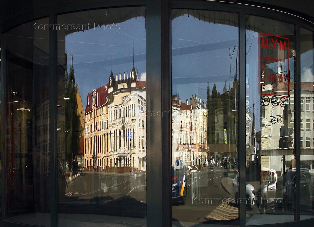Виды Пскова. Отражение зданий гогода в стеклянных входных дверях в универмаг ЦУМ.