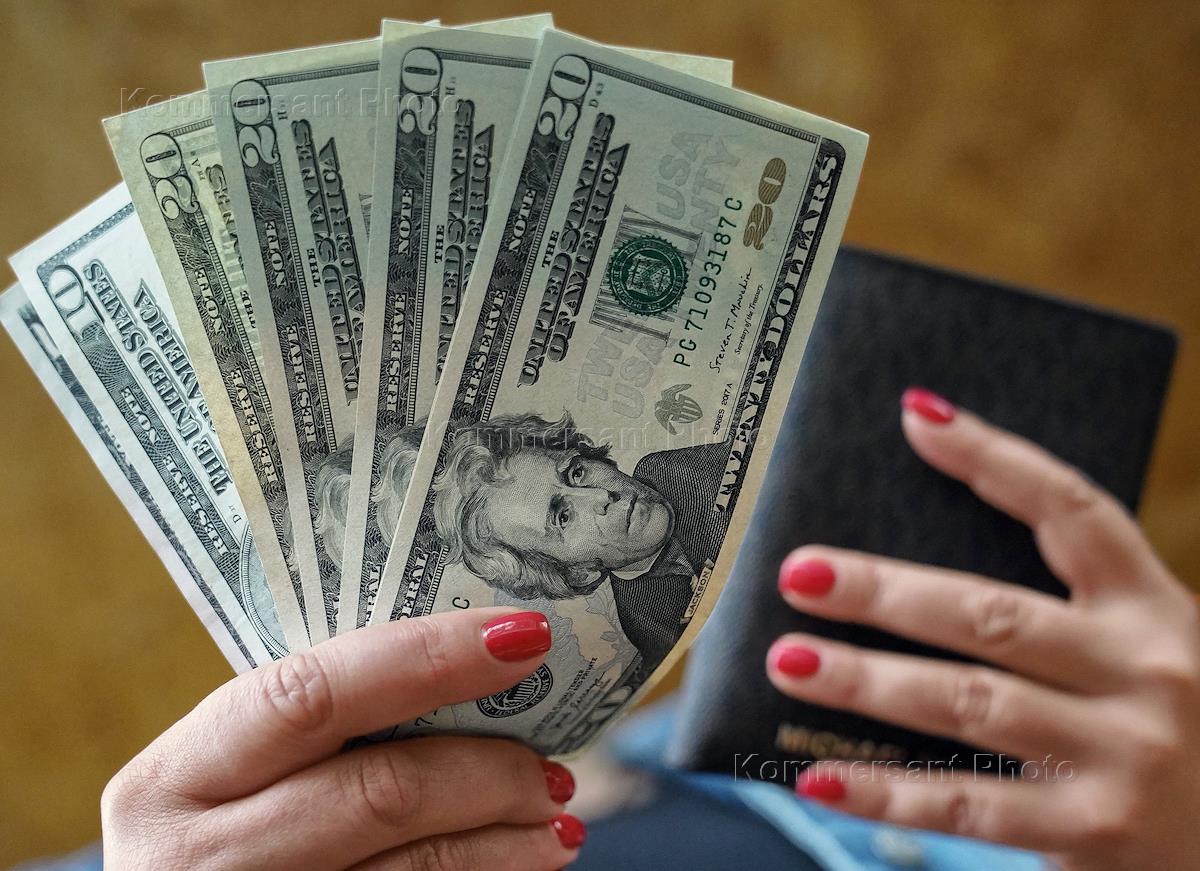 Жанровая фотография. Женщина держит в руках кошелек и долларовые купюры.