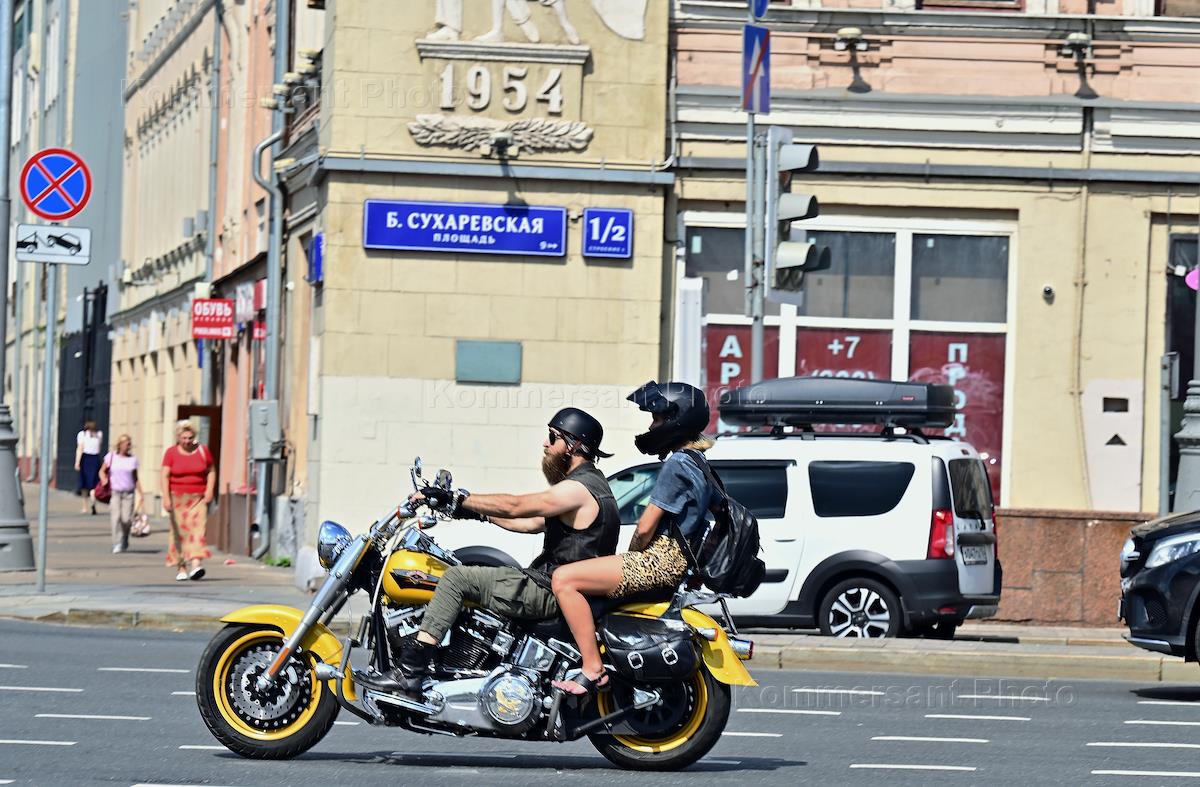 Жанровая фотография. Мотоциклист с девушкой на пассажирском сиденье едет по Большой Сухаревской…