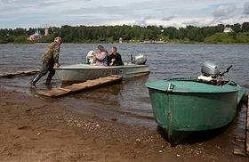 Виды Тутаева. Жанровая фотография. Мужчина толкает лодку с пассажирами от берега.