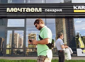 Виды Санкт-Петербурга. Жанровая фотография. Мужчина идет по улице на фоне пекарни "Мечтаем".
