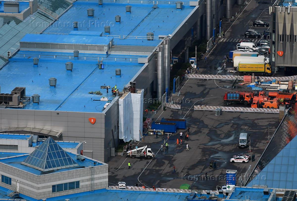 Последствия падения беспилотника (БПЛА) на территории Центрального выставочного комплекса (ЦВК) "Экспоцентр".