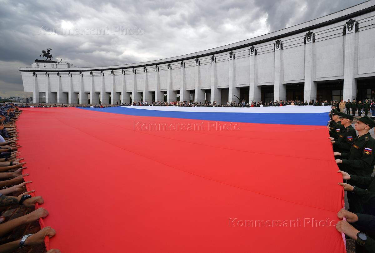 Празднование Дня государственного флага России на Поклонной горе. Военнослужащие с полотнищем…