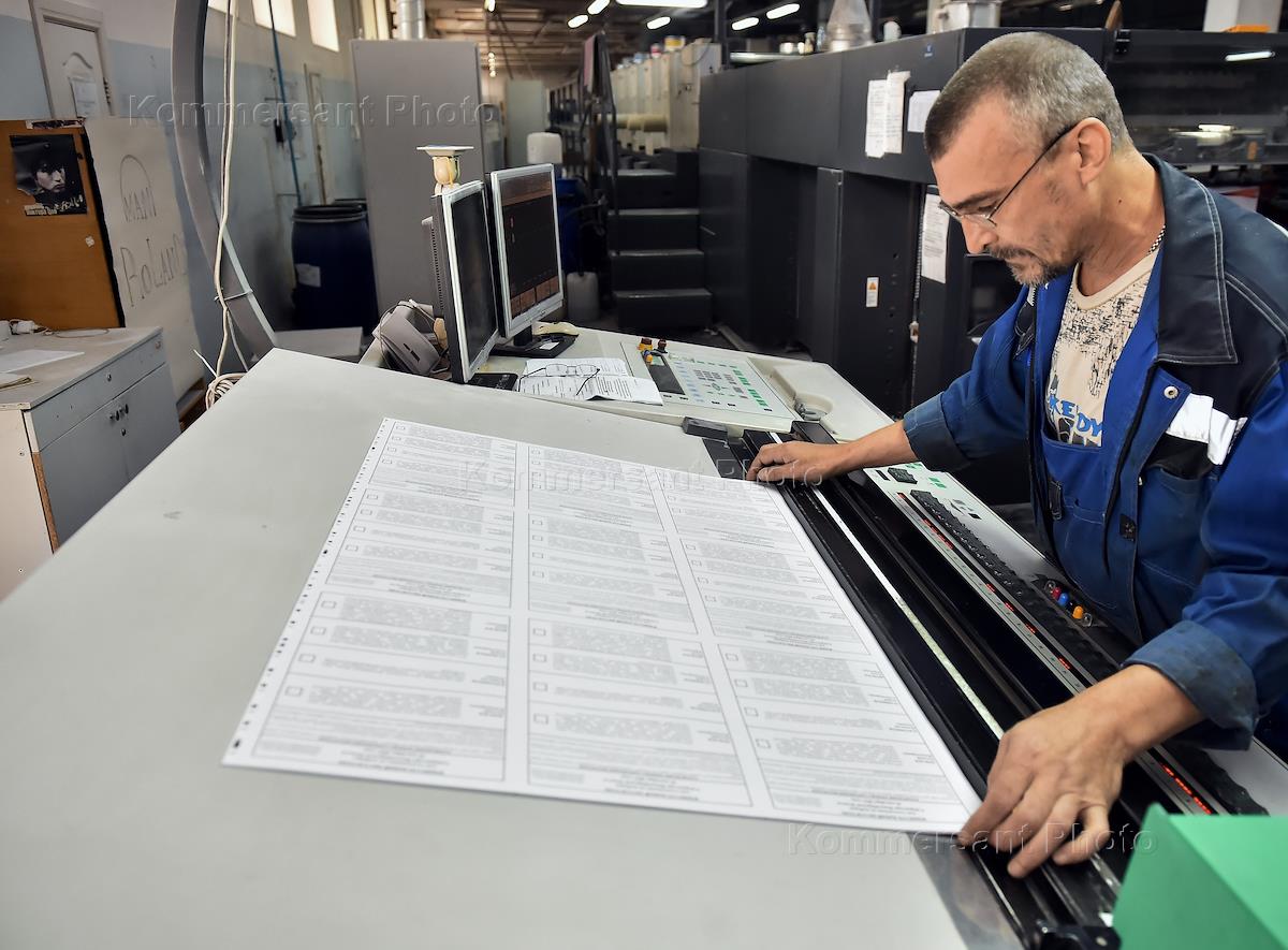 Жанровые фотографии. Изготовление бюллетеней для голосования на выборах губернатора Новосибирской области в Новосибирске.