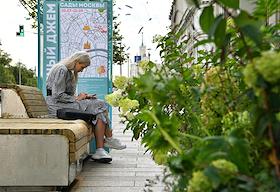 Виды Москвы. Жанровая фотография. Девушка на скамейке с мобильным телефоном.