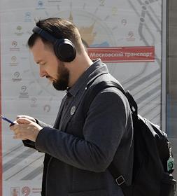 Жанровая фотография. Молодой человек в наушниках с мобильным телефоном на улице.