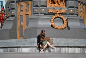 Виды Москвы. Жанровая фотография. Девушка на фоне здания часовни-памятника гренадерам, павшим в бою…