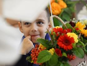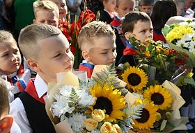День знаний (1 сентября). Жанровая фотография. Торжественная линейка в школе № 32. Букет цветов "1…