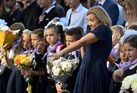 День знаний (1 сентября). Жанровая фотография. Учительница первого класса во время торжественной…