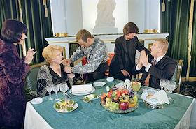 Актриса Татьяна Доронина (вторая слева) и телеведущий Урама Отт (справа) во время интервью в…