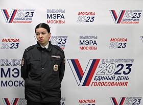 Единый день голосования (ЕДГ)-2023. Выборы мэра Москвы. Жанровая фотография. Сотрудница полиции на…