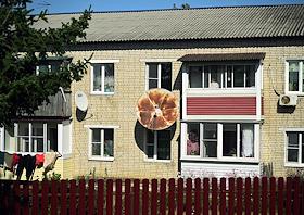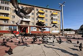 Виды рабочего поселка Ванино. Жанровая фотография. Голуби на площади перед жилым домом.