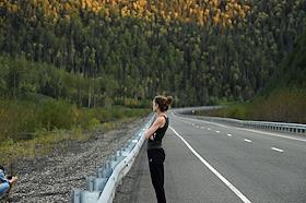 Виды Хабаровского края. Жанровая фотография. Девушка стоит на обочине пустого шоссе.
