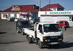 Виды рабочего поселка Ванино. Жанровая фотография. Автомобили на площадке перед кафе "Маяк".