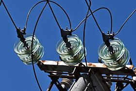 Жанровая фотография. Стеклянные изоляторы на проводах высокого напряжения линии электропередачи.