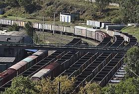 Товарные поезда дальнего следования с вагонами для перевозки угля на территории угольного терминала…