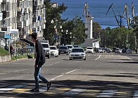Виды рабочего поселка Ванино. Жанровая фотография. Автомобильное движение на улице Железнодорожная.