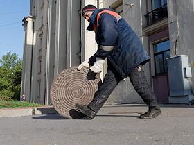Жанровая фотография. Рабочий во время ремонта дорожного покрытия и укладки асфальта на Ивановской…