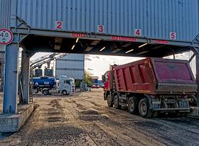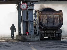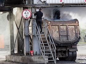 Асфальтобетонный завод (АБЗ-1). Жанровая фотография. Автомобиль во время загрузки асфальта в кузов.