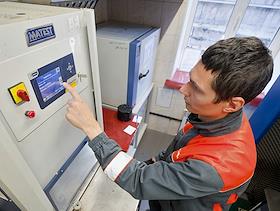 Асфальтобетонный завод (АБЗ-1). Жанровая фотография. Сотрудник лаборатории завода по тестированию…