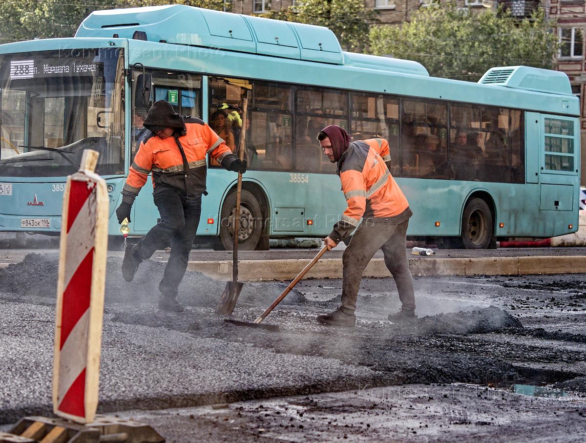 Жанровая фотография. Рабочие во время ремонта дорожного покрытия и укладки асфальта на Ивановской…