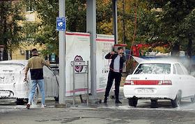 Виды Казани. Жанровая фотография. Водители моют свои автомобили на мойке сети моек самообслуживания…
