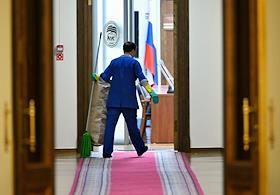Пленарное заседание Государственной думы (ГД) России. Жанровая фотография. Уборщица в коридоре ГД…
