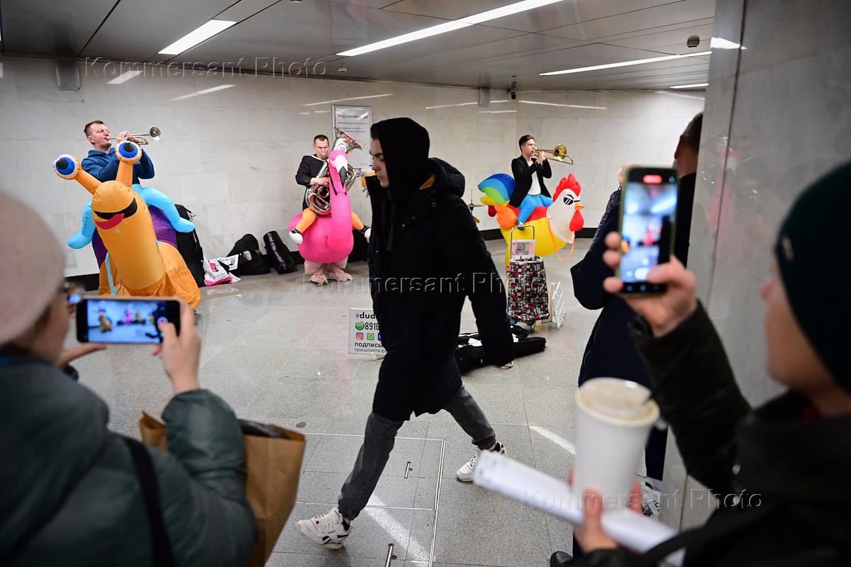 Работа станций Московского метрополитена. Жанровая фотография. Музыканты группы DUBKI BAND во время…