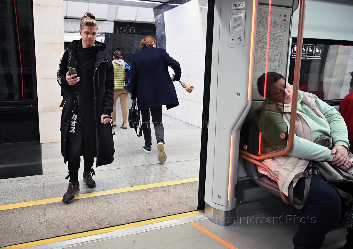 Работа станций Московского метрополитена. Жанровая фотография. Пассажир в вагоне поезда на станции…