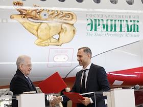 Церемония подписания договора и презентация совместного проекта Государственного Эрмитажа и авиакомпании "Россия" (группа "Аэрофлот") - новая ливрея самолета Суперджет 100 "Калуга".