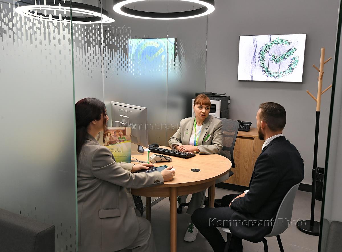 Первый офис для розничных клиентов ПАО "Сбербанк". Жанровая фотография. Сотрудники и клиенты в офисе.