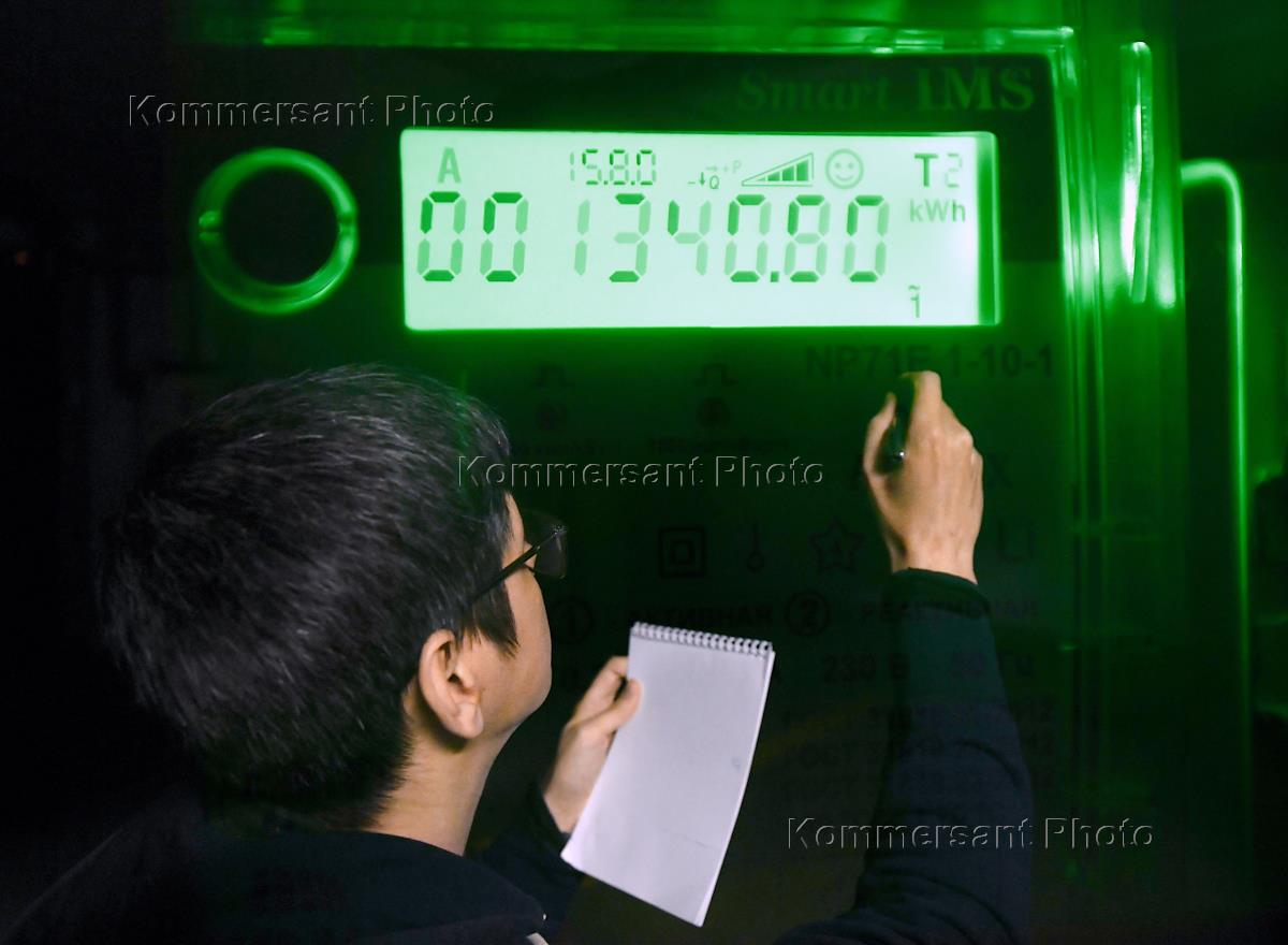 Жанровая фотография. Молодой человек снимает показания электросчетчика по расходу электроэнергии.