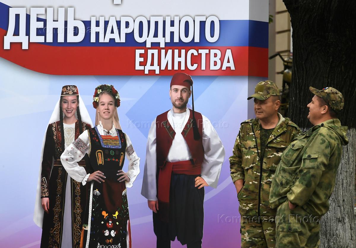 Празднование Дня народного единства в Крыму. Жанровая фотография. Военнослужащие стоят у баннера,…