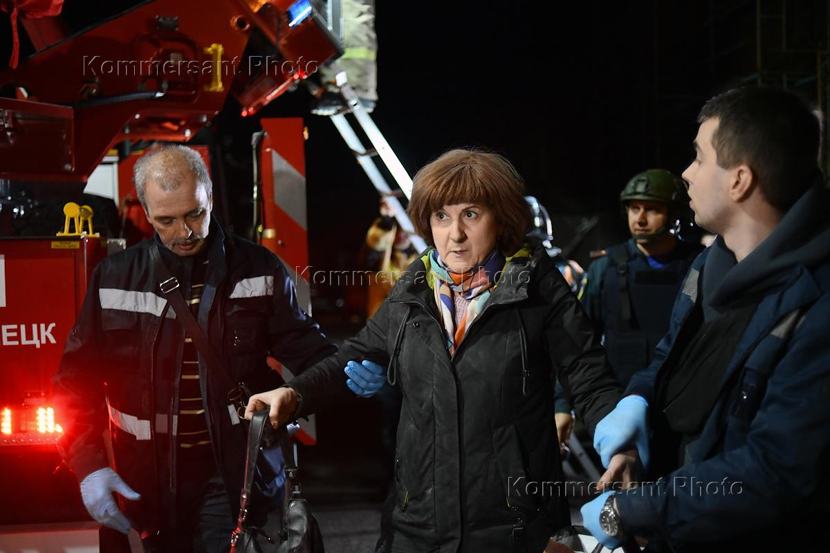 Последствия обстрела Донецка. Сотрудники пожарной службы во время эвакуации жителей.