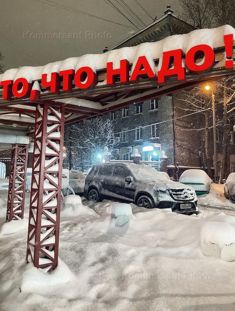 Снегопад в Москве. Жанровая фотография. Виды Москвы. Мужчина идет по сугробам через дорогу под…