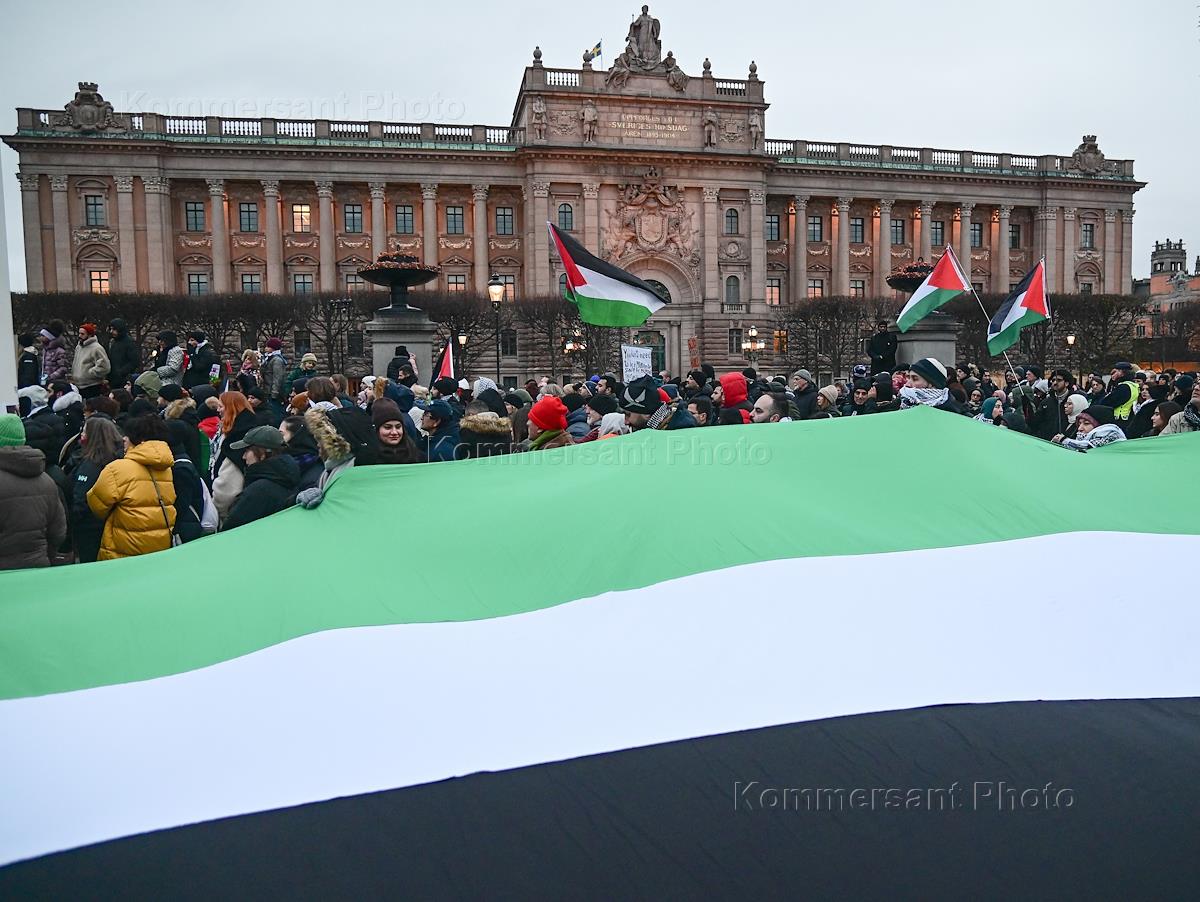 Митинг в поддержку Палестины прошел на площади перед зданием парламента Швеции. Участники во время…