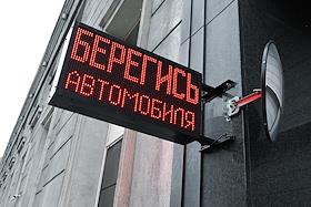 Виды Москвы. Жанровая фотография. Табло "Берегись автомобиля" при выезде из подземной парковки в…