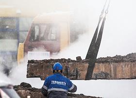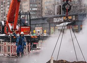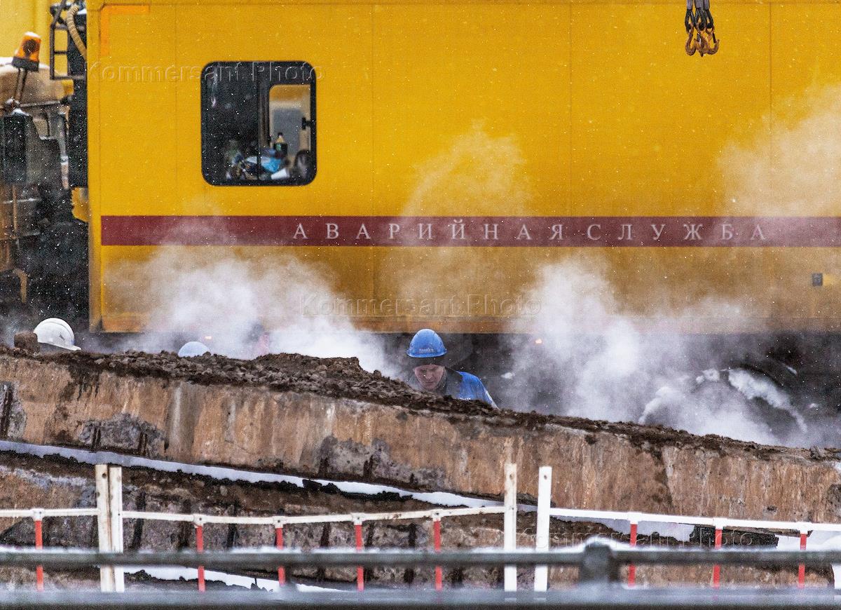 Жанровая фотография. Рабочие во время устранения аварийной ситуации прорыва горячего водоснабжения…