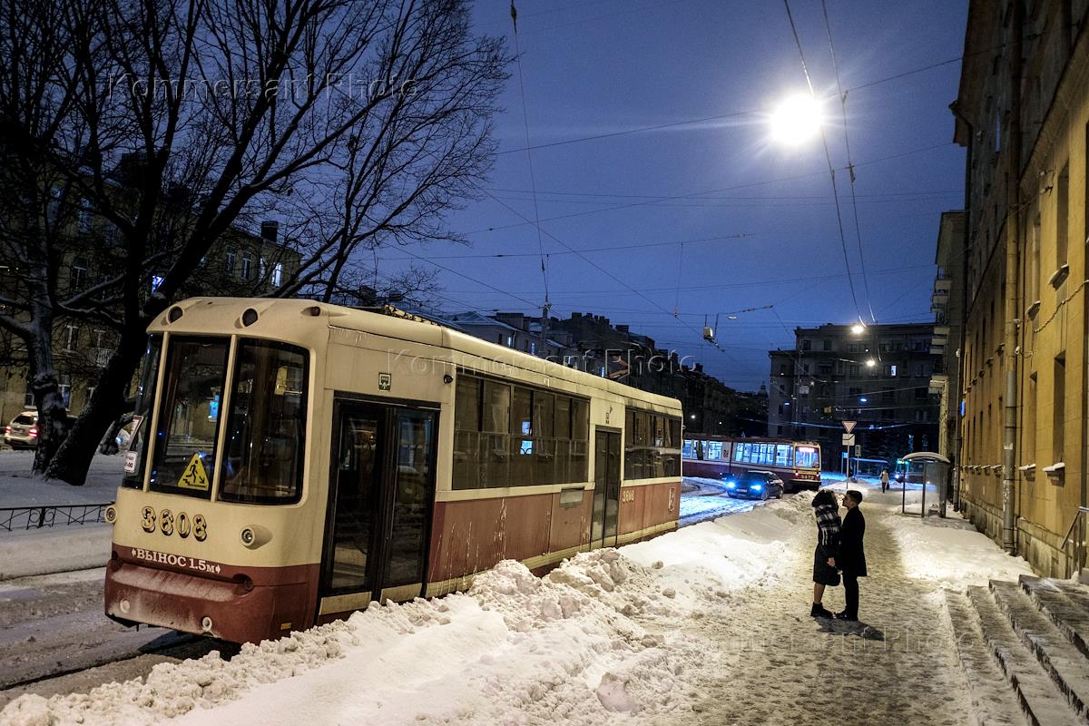 Жанровая фотография. Аварийная остановка трамваев. Пара молодых людей стоят на остановке трамвая.