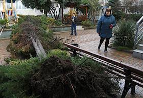 Последствия шторма в Крыму. Жанровая фотография. Сотрудники коммунальных служб убирают поваленные…
