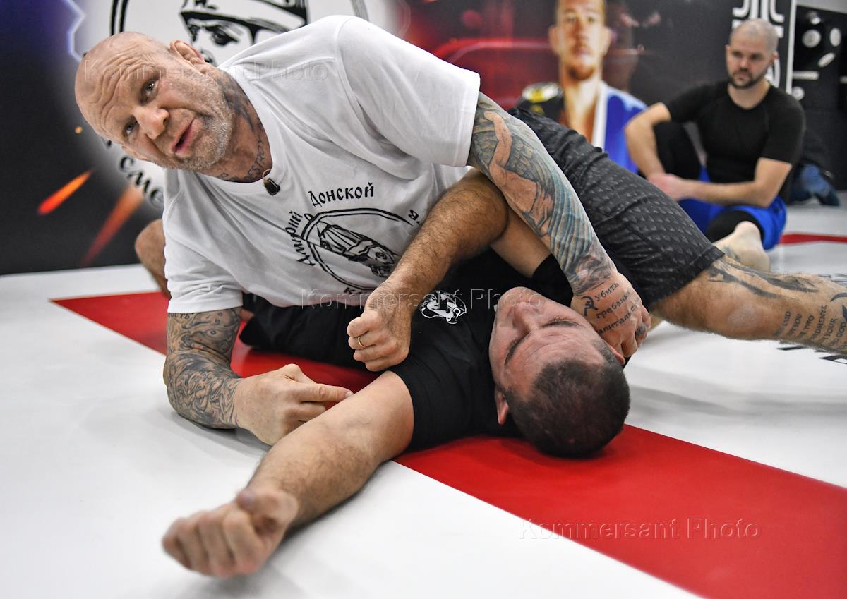 Боец смешанных единоборств Джеффри Монсон (слева) во время открытой тренировки в спорт клубе города…