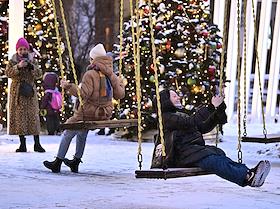 Виды Москвы. Жанровая фотография. Новогоднее оформление города. Девушки качаются на качелях на…