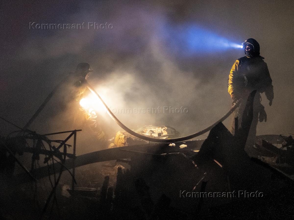 Последствия обстрела города Ясиноватая. Пожар в жилом доме после обстрела. Сотрудники пожарной…