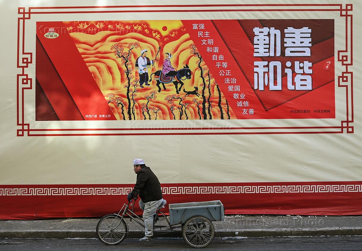 Виды Пекина. Жанровая фотография. Рабочий в каске на улице.