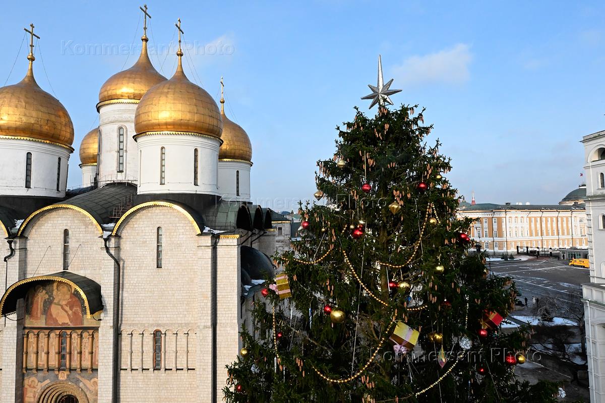 Украшение главной новогодней ели России на Соборной площади Московского Кремля.