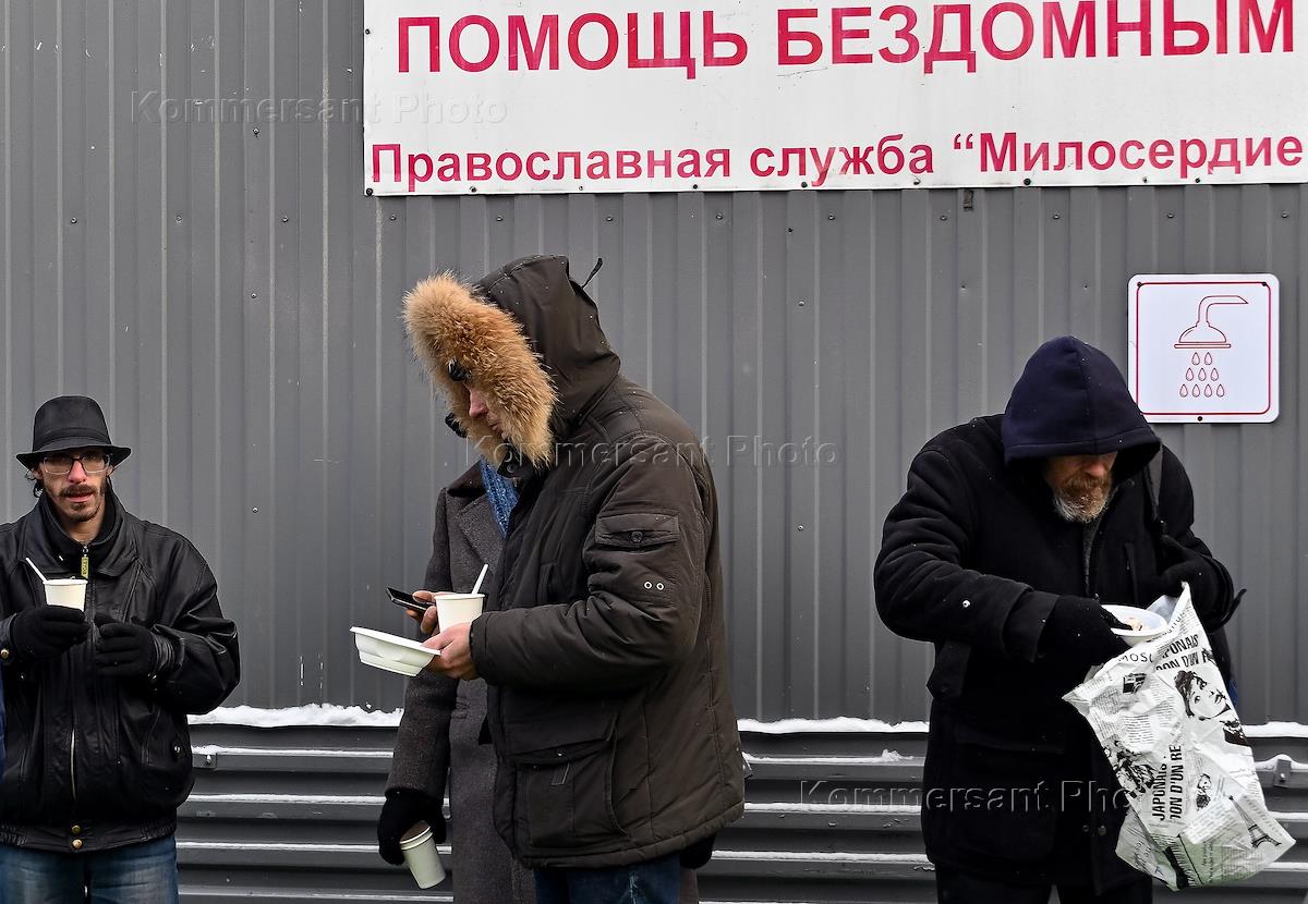 Рождественские обеды для бездомных в "Ангаре спасения" православной службы "Милосердие". Жанровая…