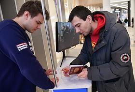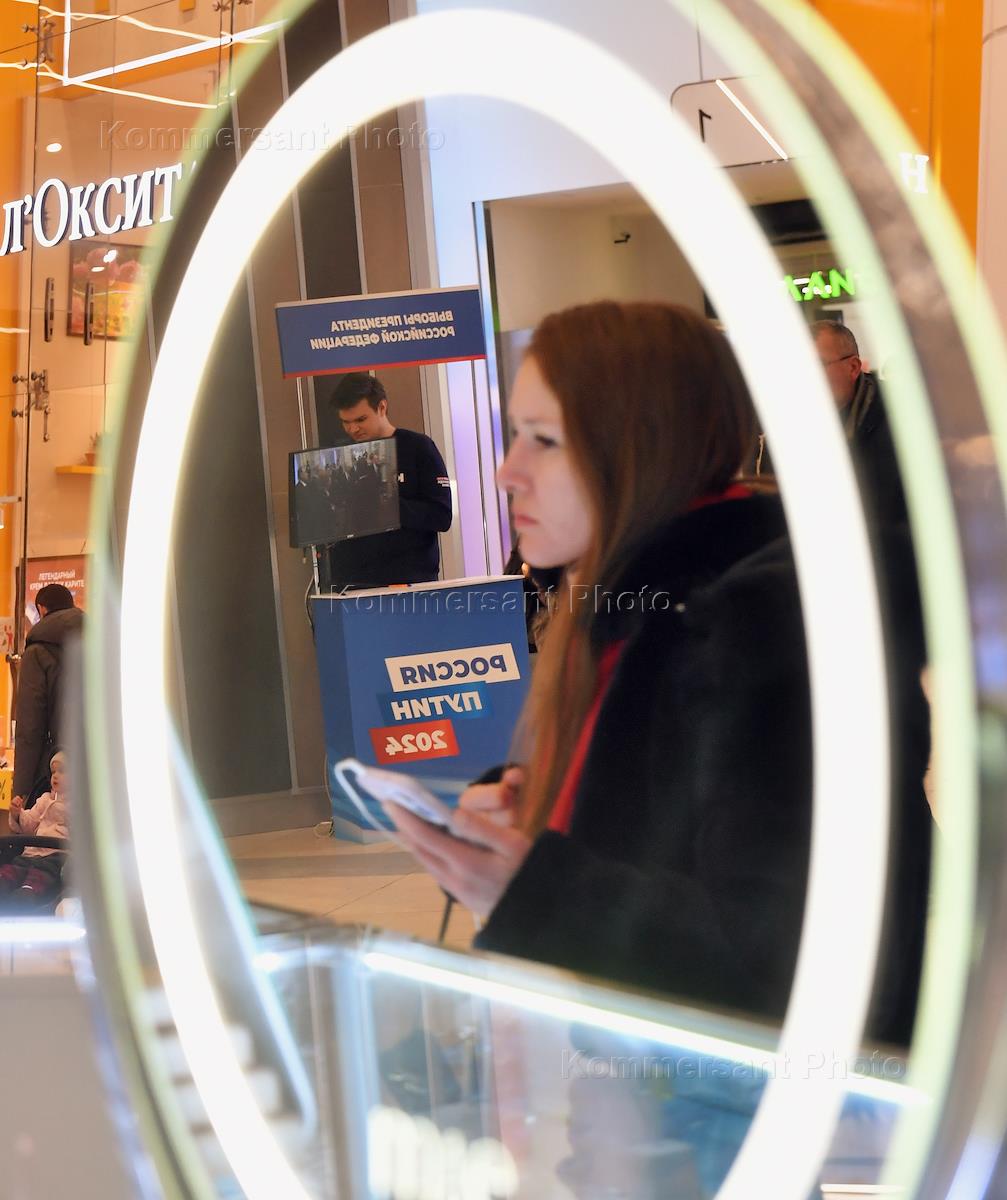 Пункт сбора подписей в поддержку самовыдвижения Владимира Путина на выборы президента России в торговом центре "Сити Молл".